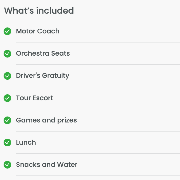 Package includes motor coach transportation, lunch, ORCHESTRA seats, trip leader, driver's gratuity