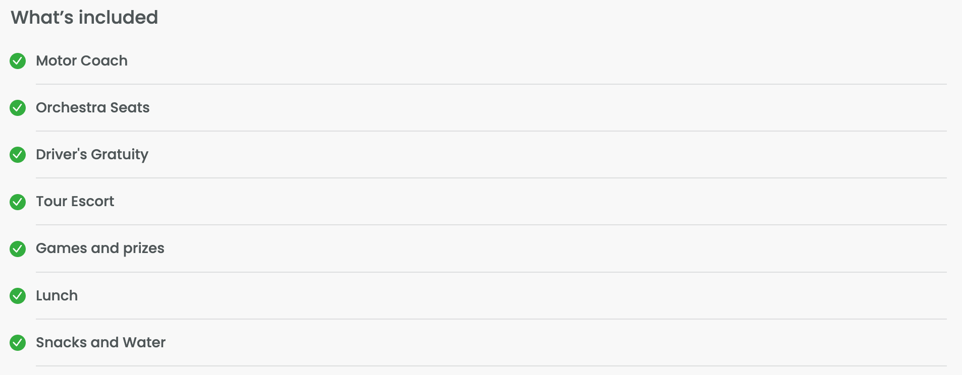 Package includes motor coach transportation, lunch, ORCHESTRA seats, trip leader, driver's gratuity