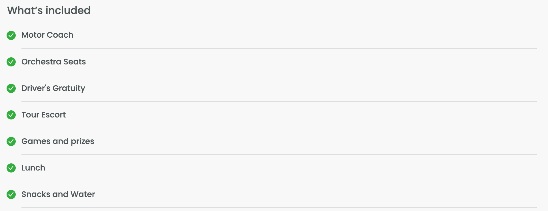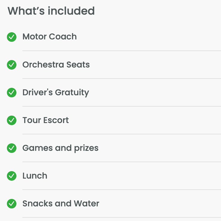 Package includes motor coach transportation, lunch, ORCHESTRA seats, trip leader, driver's gratuity $283
