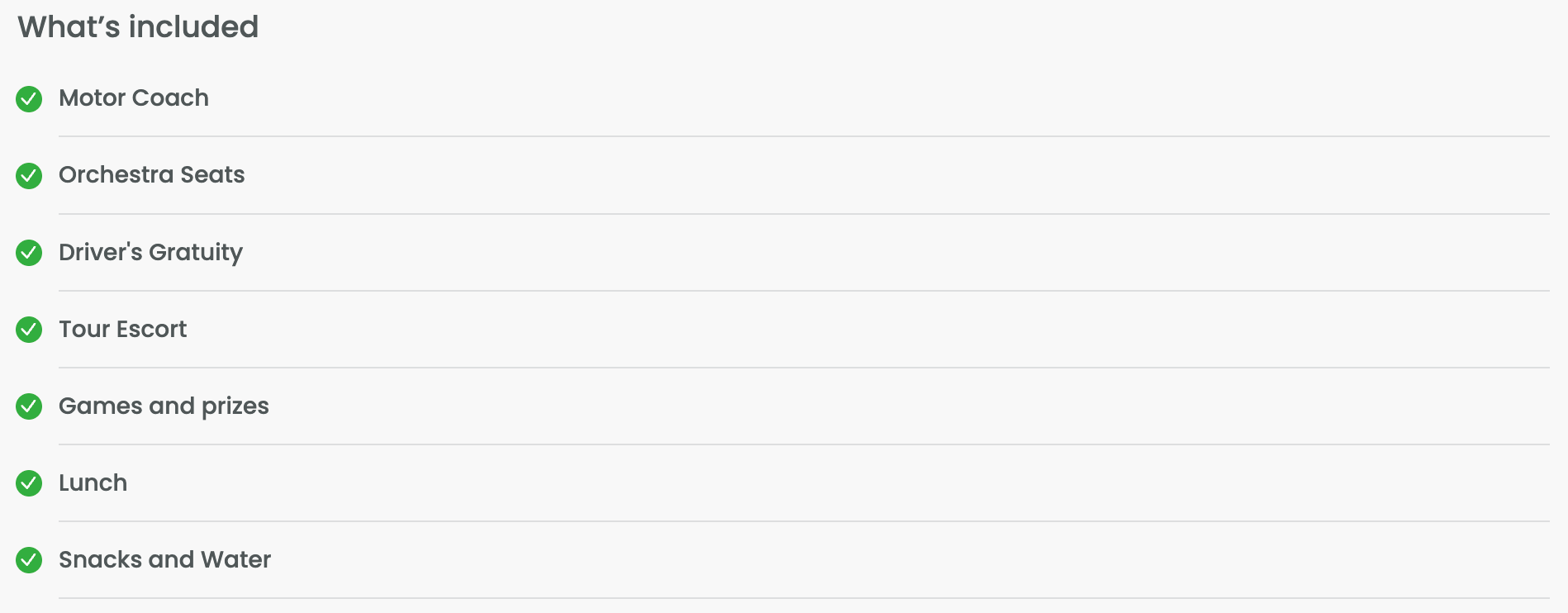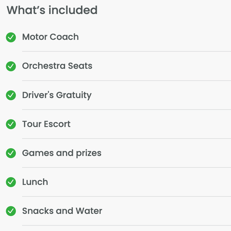 Package includes motor coach transportation, lunch, ORCHESTRA seats, trip leader, driver's gratuity