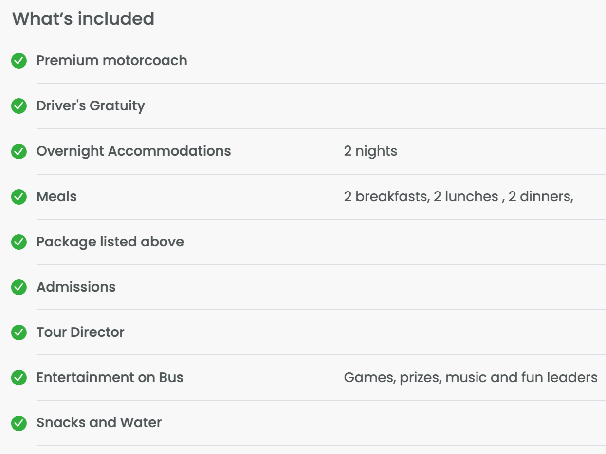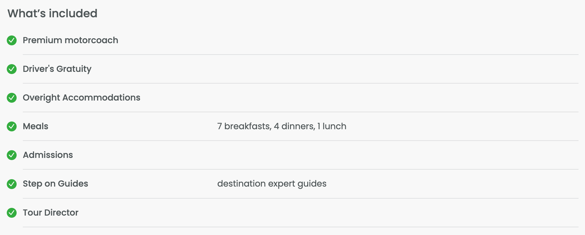 * Seven Nights Lodging * Seven Breakfasts * One Boxed Lunch * Four Dinners* All Gratuities for Driver and Included Meals * All Taxes and Tips on above services