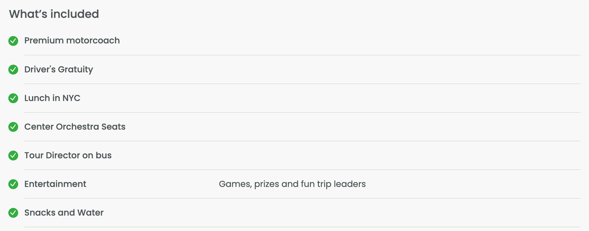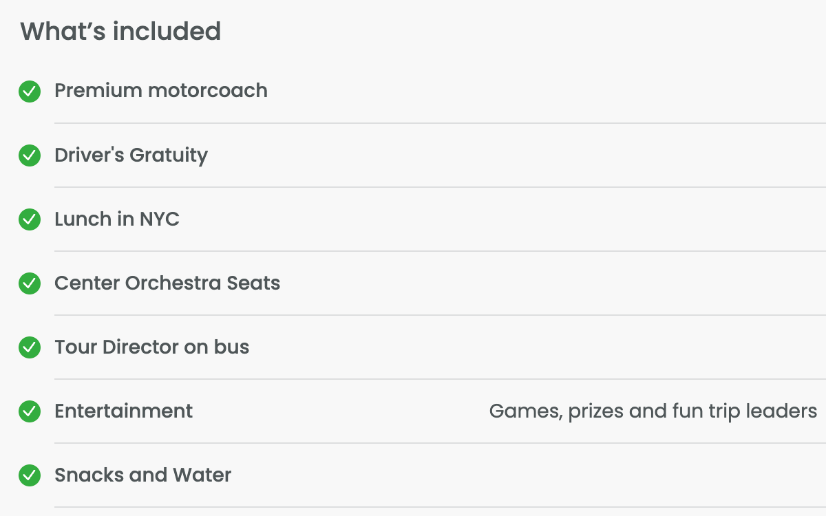 Package includes motor coach transportation, lunch, ORCHESTRA seats, trip leader, driver's gratuity $355