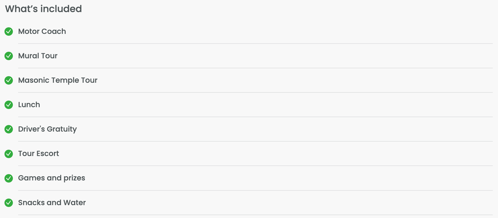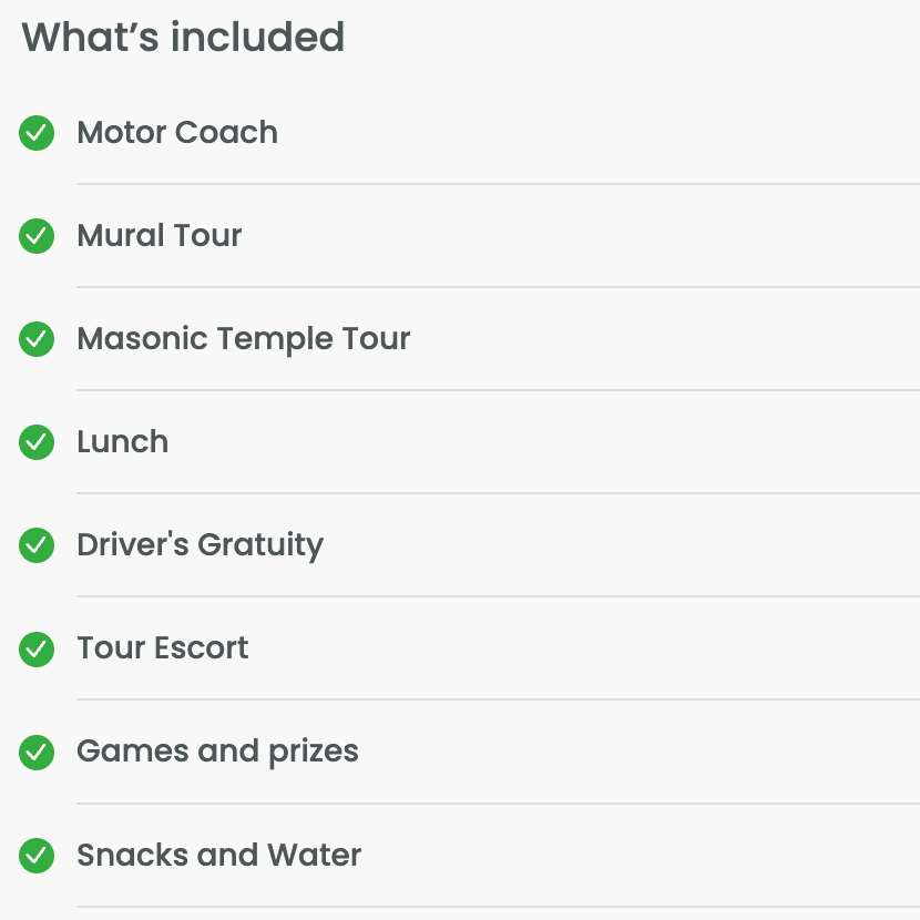 Package includes motor coach mural tour, lunch, Masonic Temple Tour and drivers gratuity $139