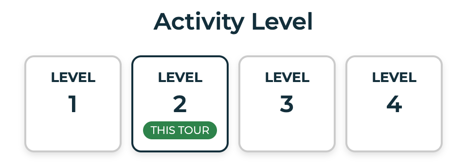 You like a balanced approach to travel. Walking two to three miles over the course of a day is no problem for you. You can partake in a two-hour leisurely walking tour, covering up to two miles (with included breaks). You can handle a variety of terrains, from cobblestone streets to moderate hills with relative ease and without assistance. You can climb two flights of stairs with ease. There may be 1 to 2 days on this tour when walking tours can cover 3 to 4 miles over uneven terrain. You can handle altitudes up to 6,000 feet.