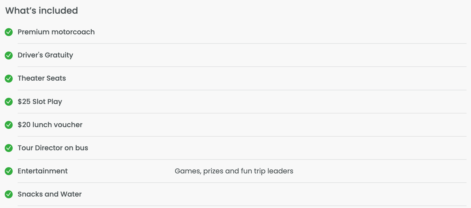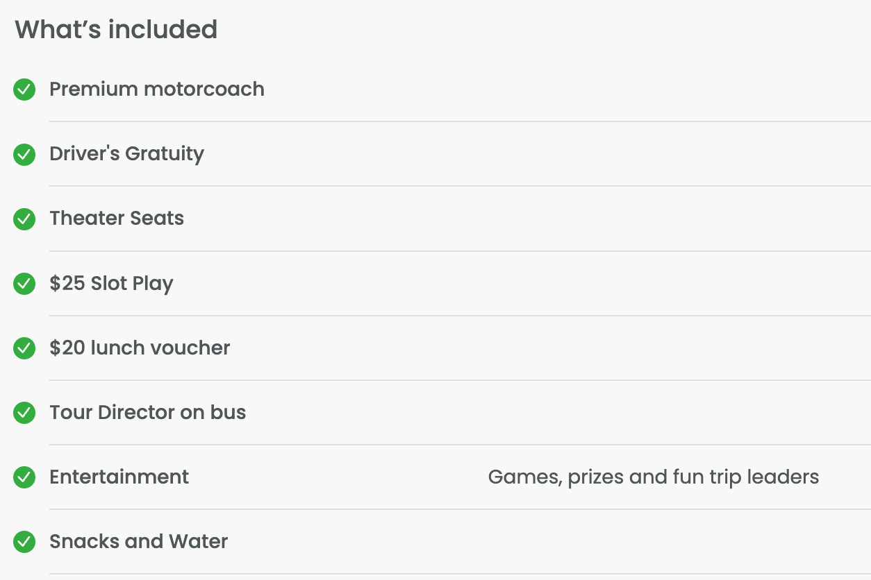 Package includes motor coach transportation, $25 slot play, $20 food credit for restaurant in Tropicana, Show, driver's gratuity and trip leader. Bus departs GSP Park and Ride Exit 98 8:30 AM, Target Brick 8:45 AM, Celia Cruz Rest Area, Forked River 9 AM approximate 6 PM return $125