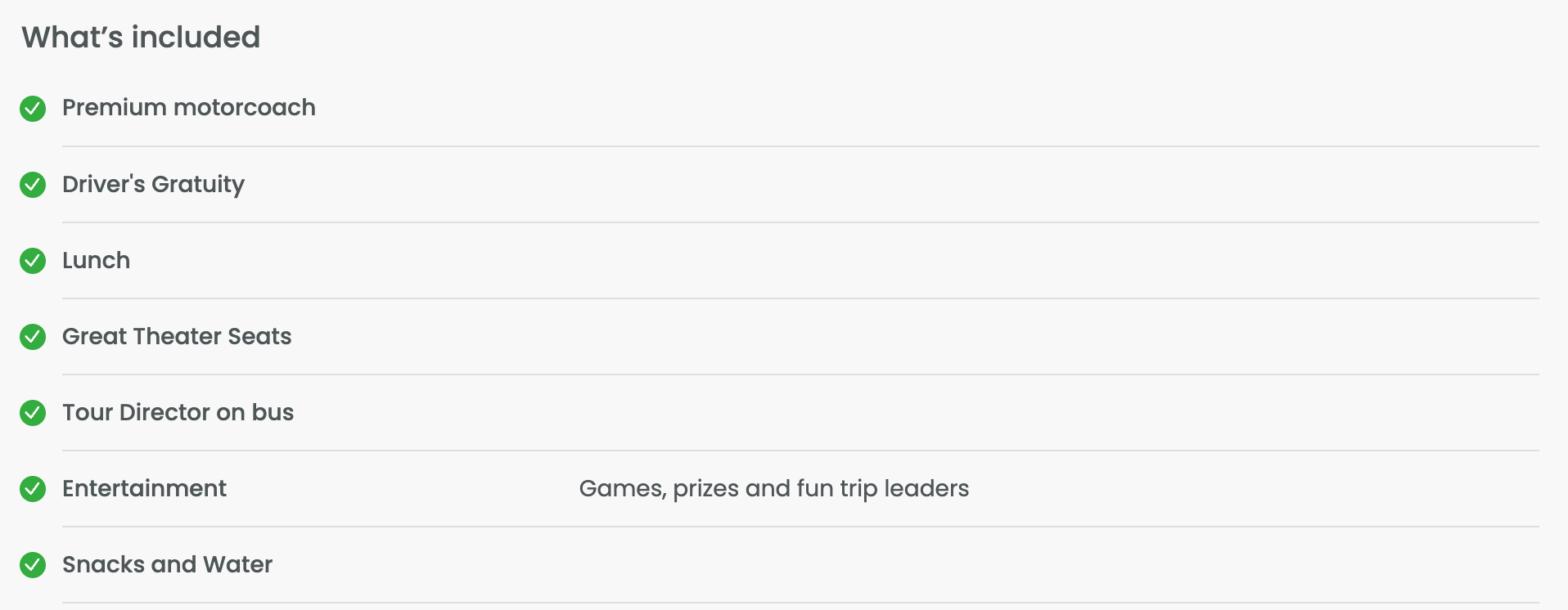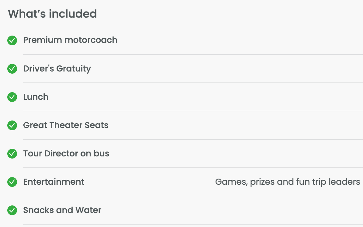 Package includes motor coach transportation, theater seats, lunch, driver's gratuity and trip leader.